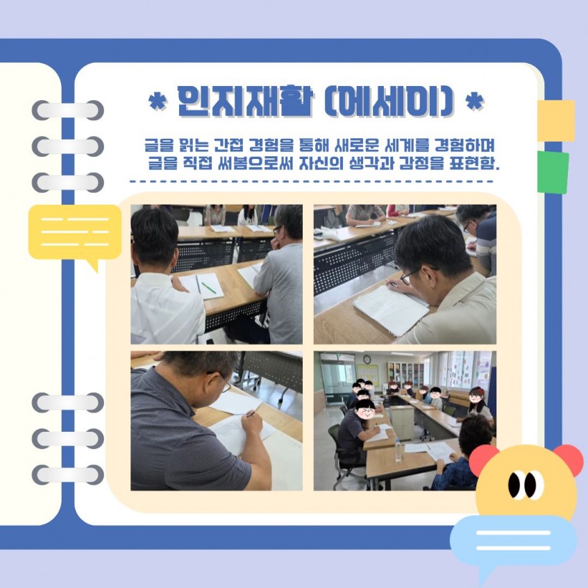 독서요법은 글을 읽고 쓰는 과정을 통해 스스로의 감정과 생각을 표현하며 정서적 안정을 도모하는 시간이었습니다.