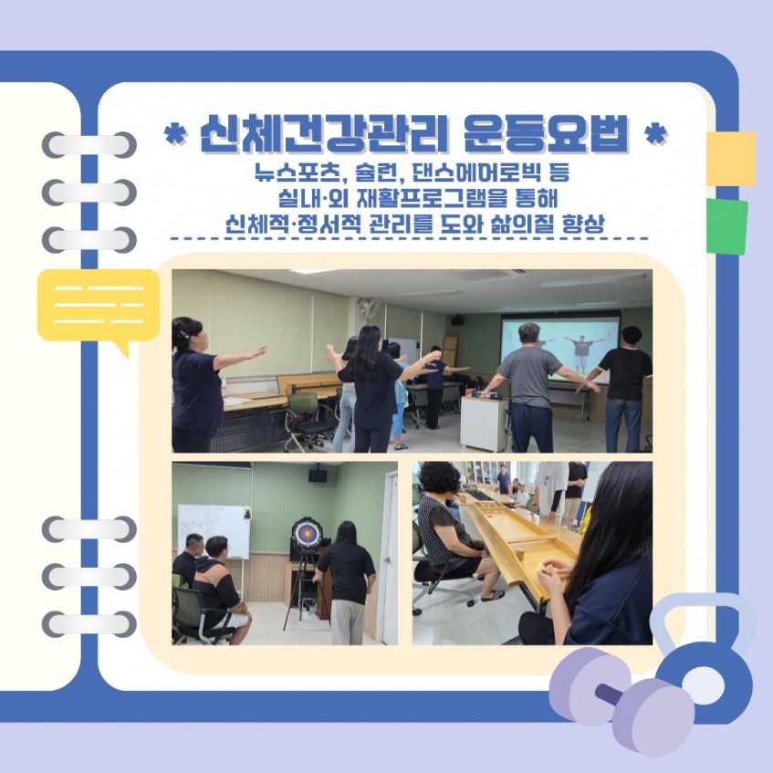 생활체육과 댄스에어로빅 등 신체건강관리 프로그램을 통해 건강한 생활리듬을 회복하고 신체적·정서적 활력을 높여갔습니다.