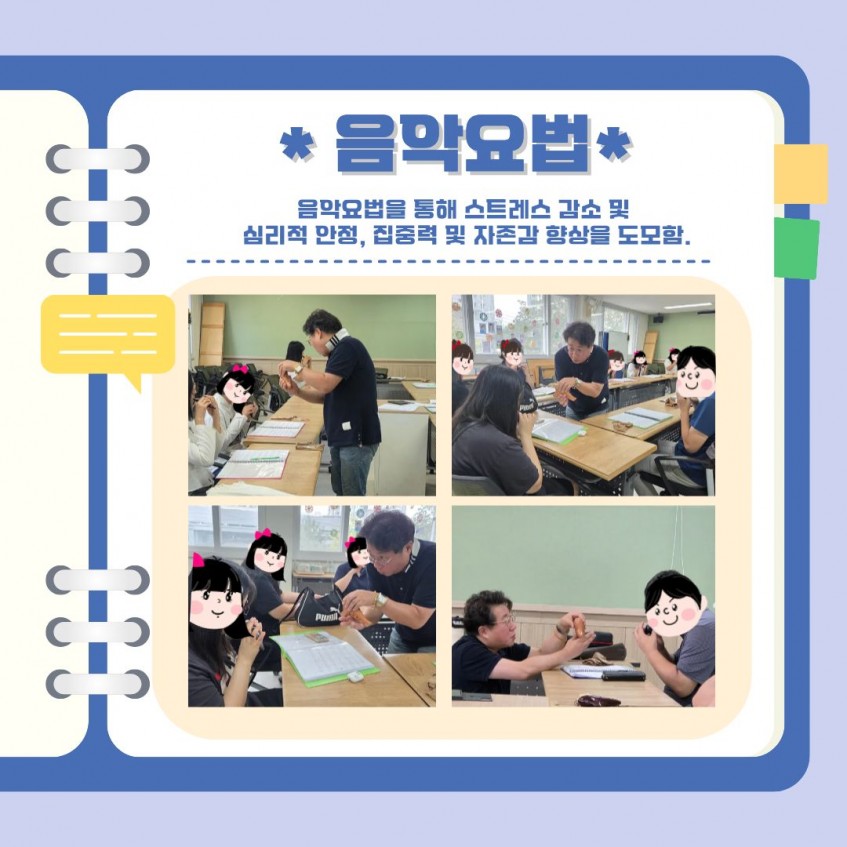 음악요법(오카리나)에서는 연주의 즐거움 속에서 심리적 안정과 집중력 향상을 경험했습니다.