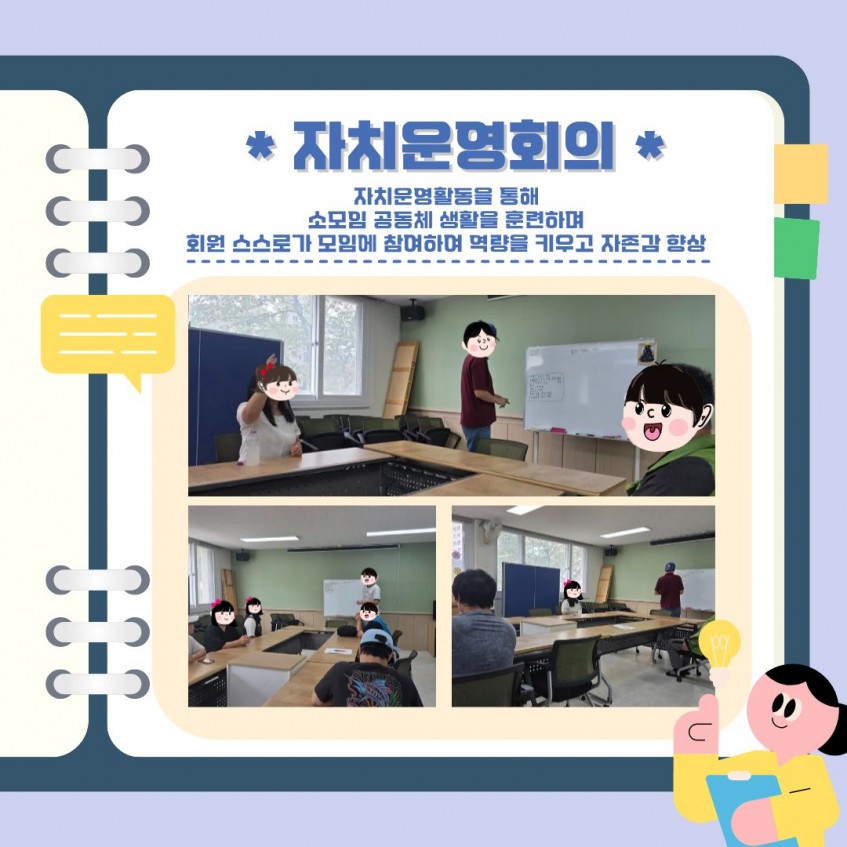 자치운영회의에서는 회원 스스로 모임을 운영하며 공동체 참여와 자존감 증진을 경험했습니다.