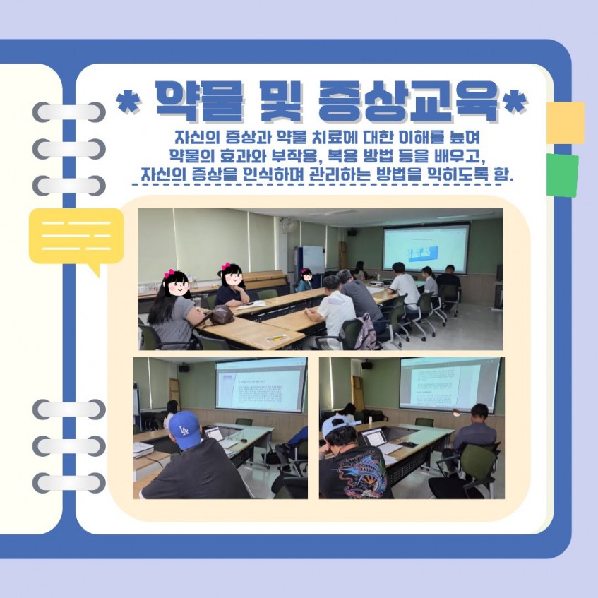 약물 및 증상교육을 통해 치료 과정에 대한 이해를 높이고, 자신의 증상을 인식하며 관리하는 실질적 역량을 키워갔습니다.
